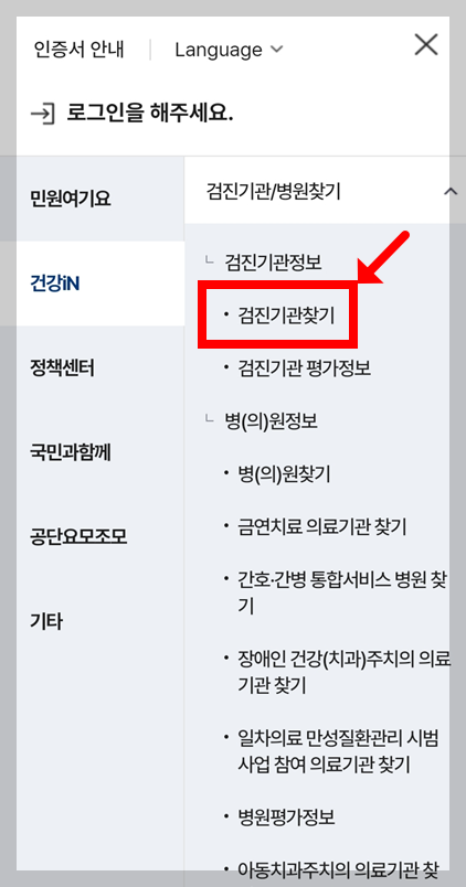 메뉴중에서 건강iN의 검진기간/병원찾기를 선택합니다.